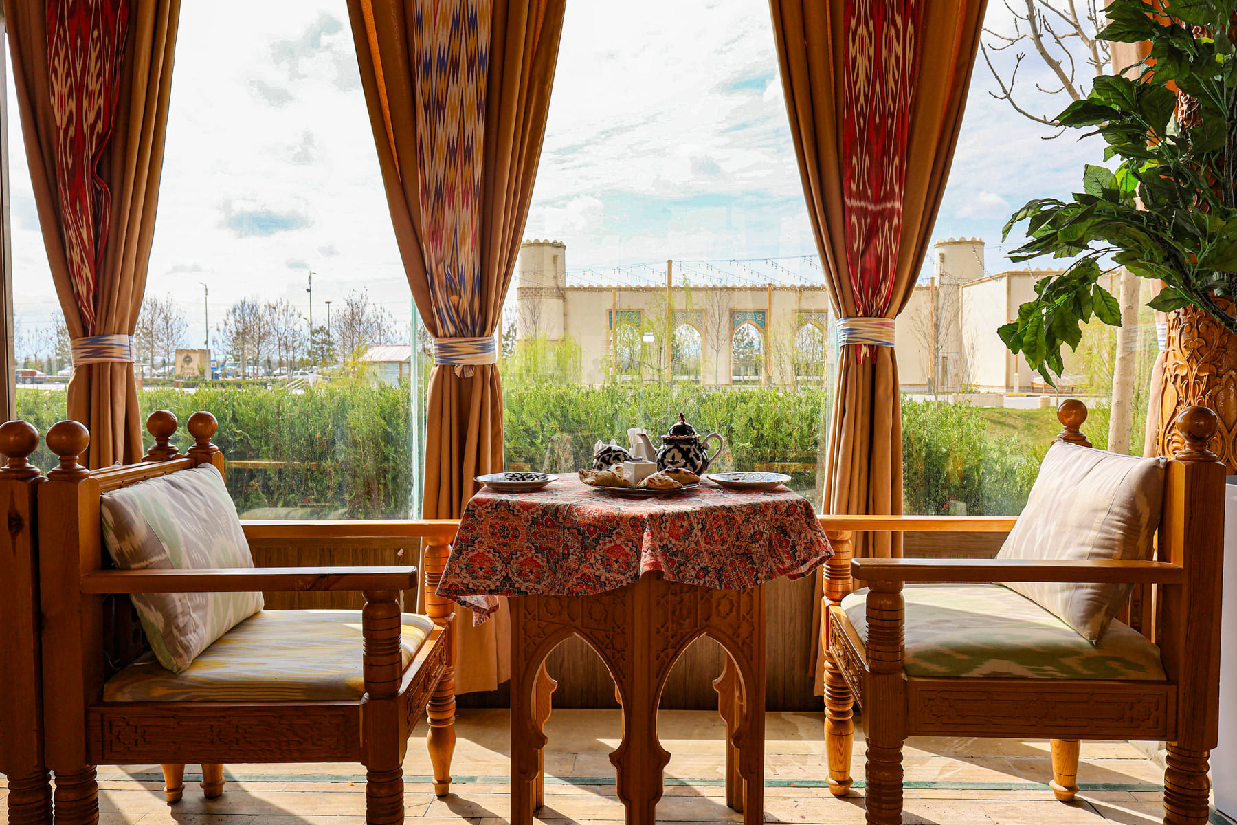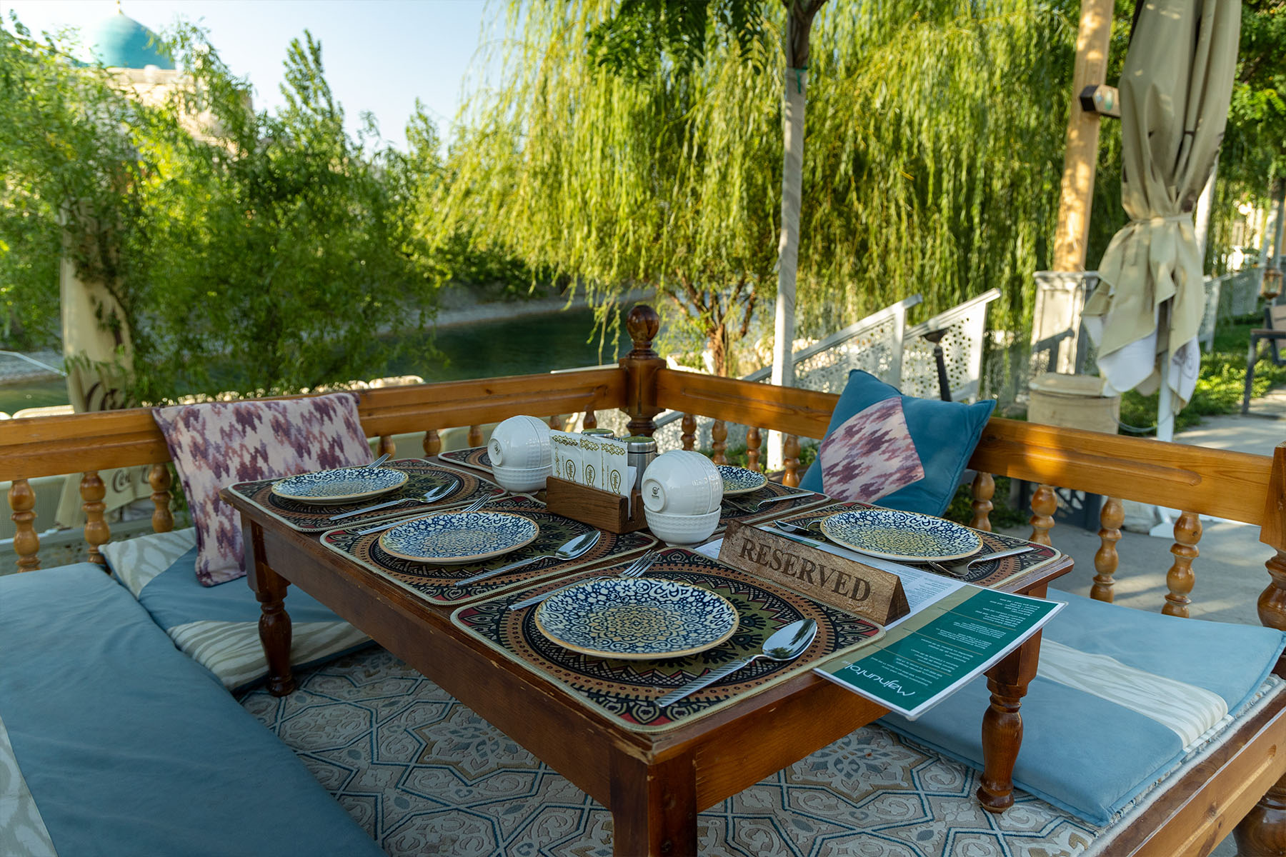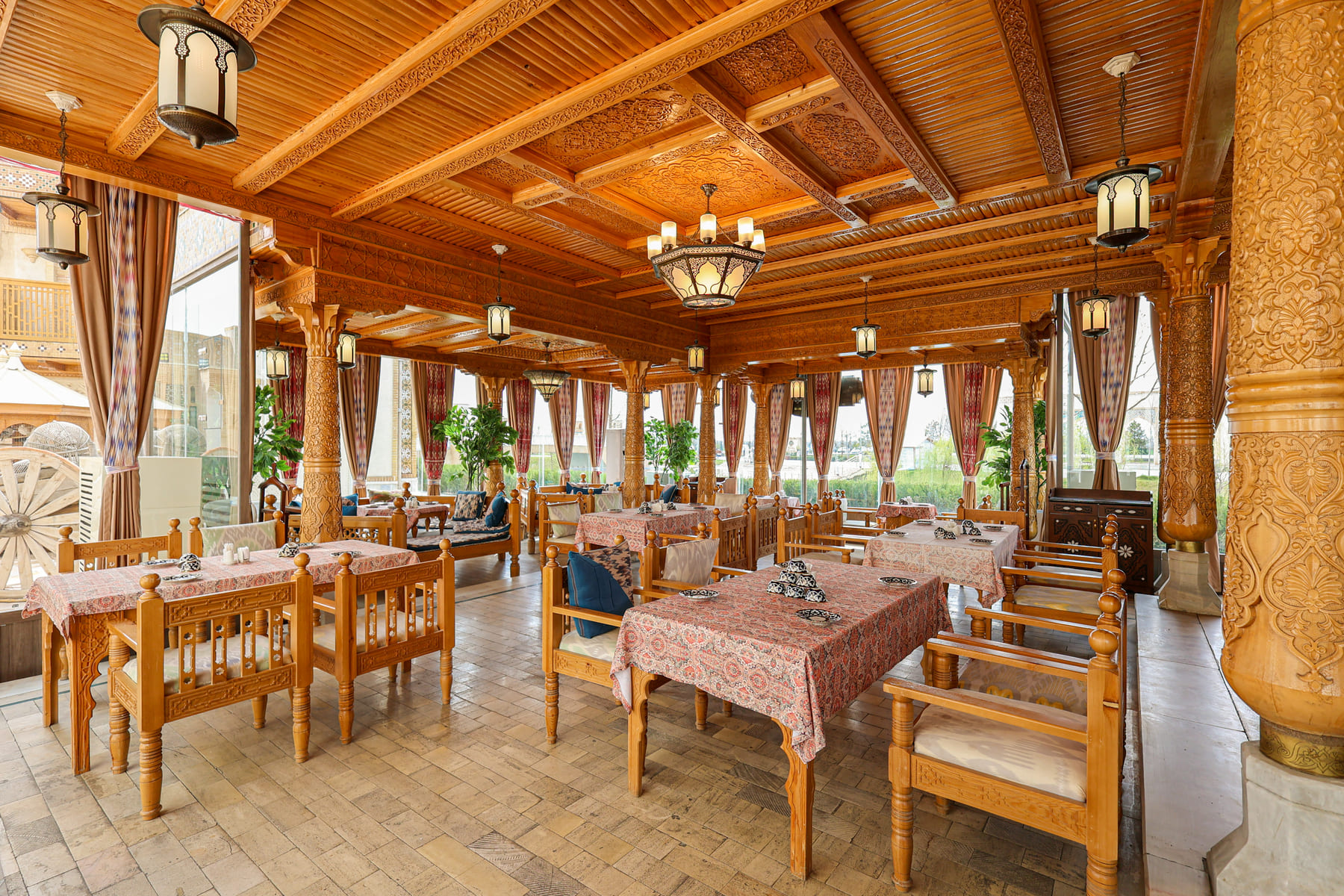 The restaurant accommodates up to 400 people and is suitable for hosting banquet events in the national Uzbek style. The menu focuses on Uzbek cuisine and traditional Eastern recipes. The dishes are prepared from local products, absorbing the bright sun and fresh air, to preserve the authenticity of flavors and cooking techniques.