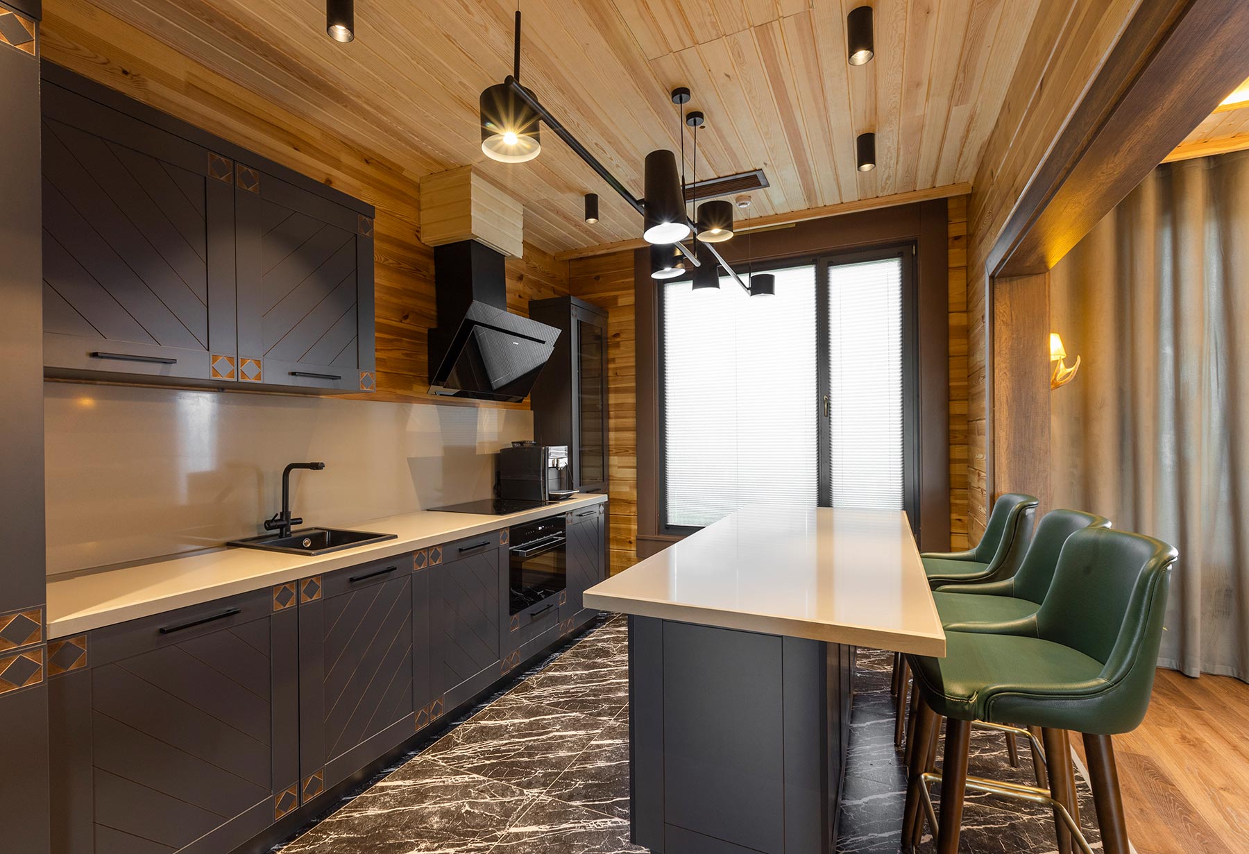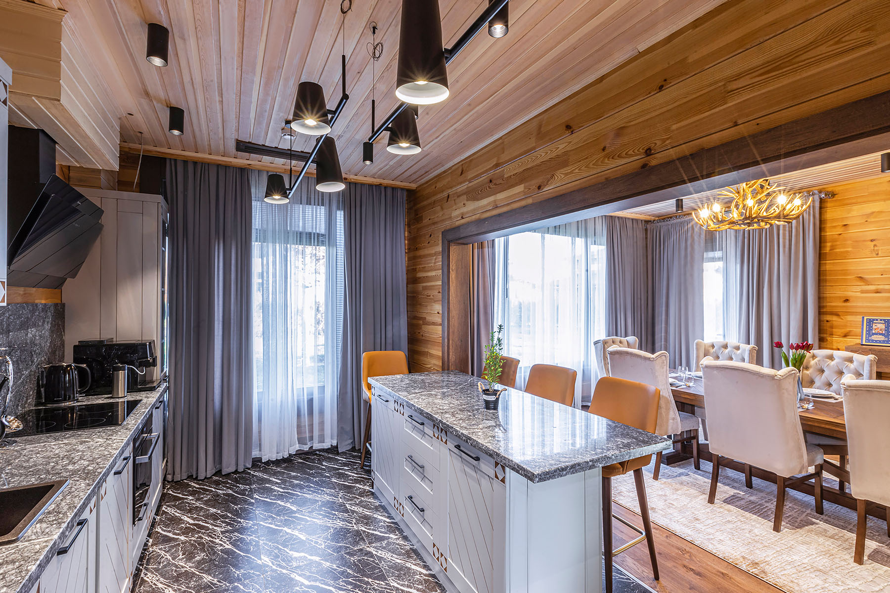 Возможно размещение до 8 человек: 1 спальня с собственными ванной и гардеробной на первом этаже, 3 спальни на втором этаже, две из которых с собственной ванной комнатой, а также общая ванная комната на этаже.