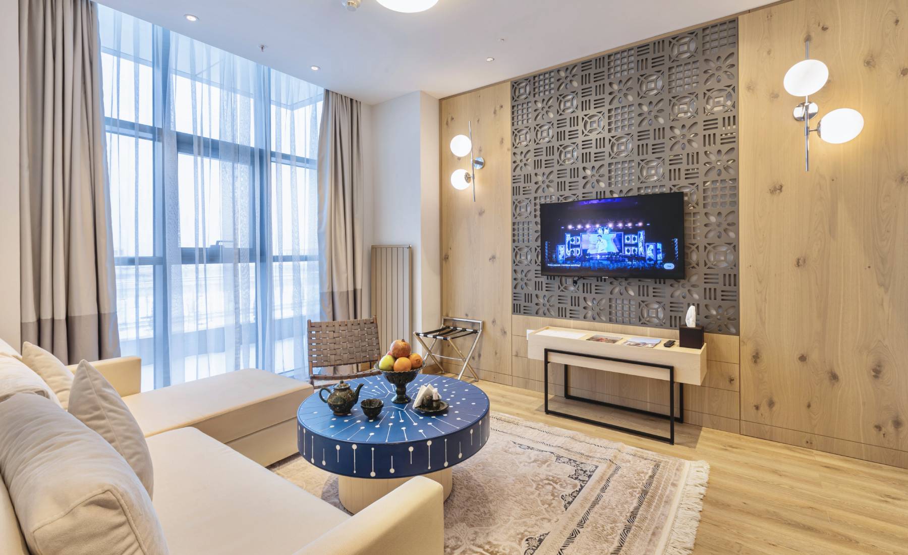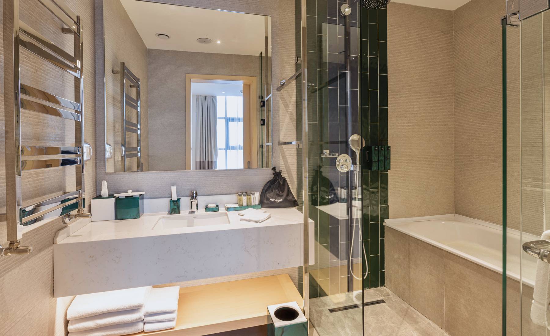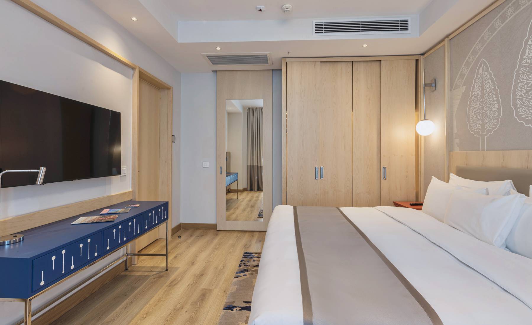 غرفة لغير المدخنين. من بين وسائل الراحة: مكيف هواء وتلفزيون بشاشة مسطحة بقياس 49 بوصة وبار صغير وخزنة ومرافق لكي الملابس وآلة تحضير الشاي وهاتف وقنوات تلفزة فضائية ورداء حمام ونعل ومجموعة من مستحضرات الاستحمام ومجفف شعر