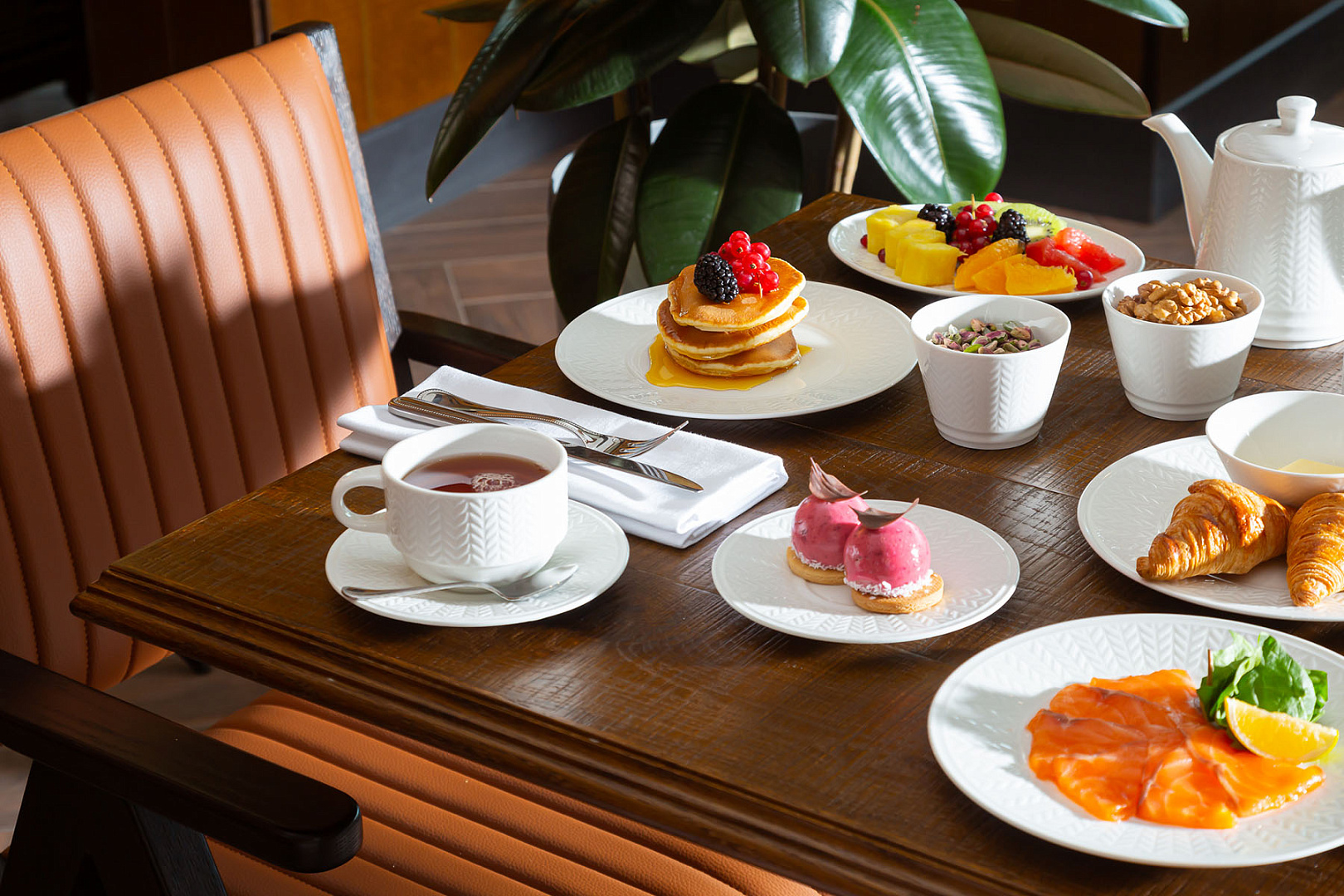 Гостей ждет большой выбор алкогольных напитков, элитных сортов чая, свежевыжатых соков, закусок, оригинальных салатов и десертов.