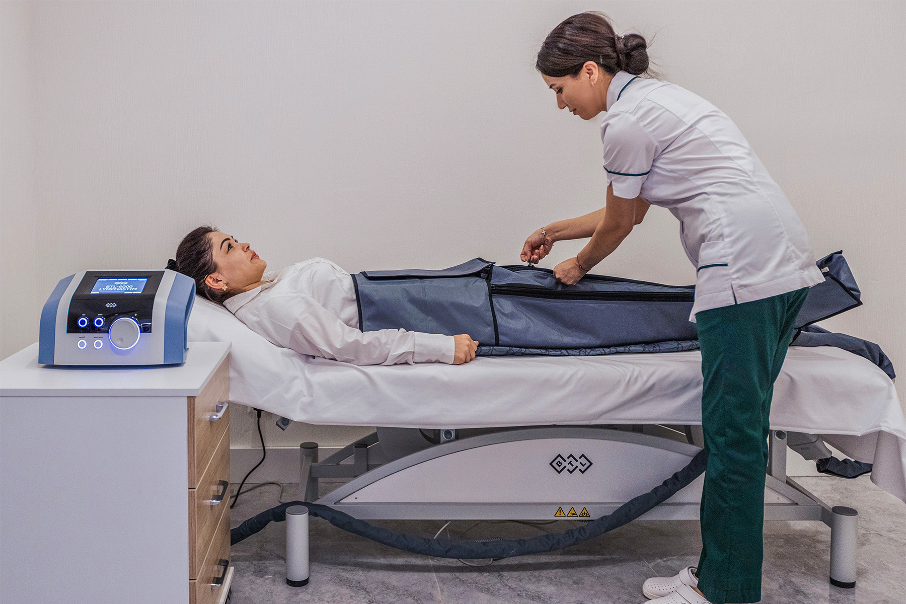 Pressoterapiya (30 daqiqa): maxsus havo massaji. Qon aylanishini yaxshilaydi, ortiqcha suyuqlikni chiqaradi va shishlarni kamaytirishga yordam beradi.